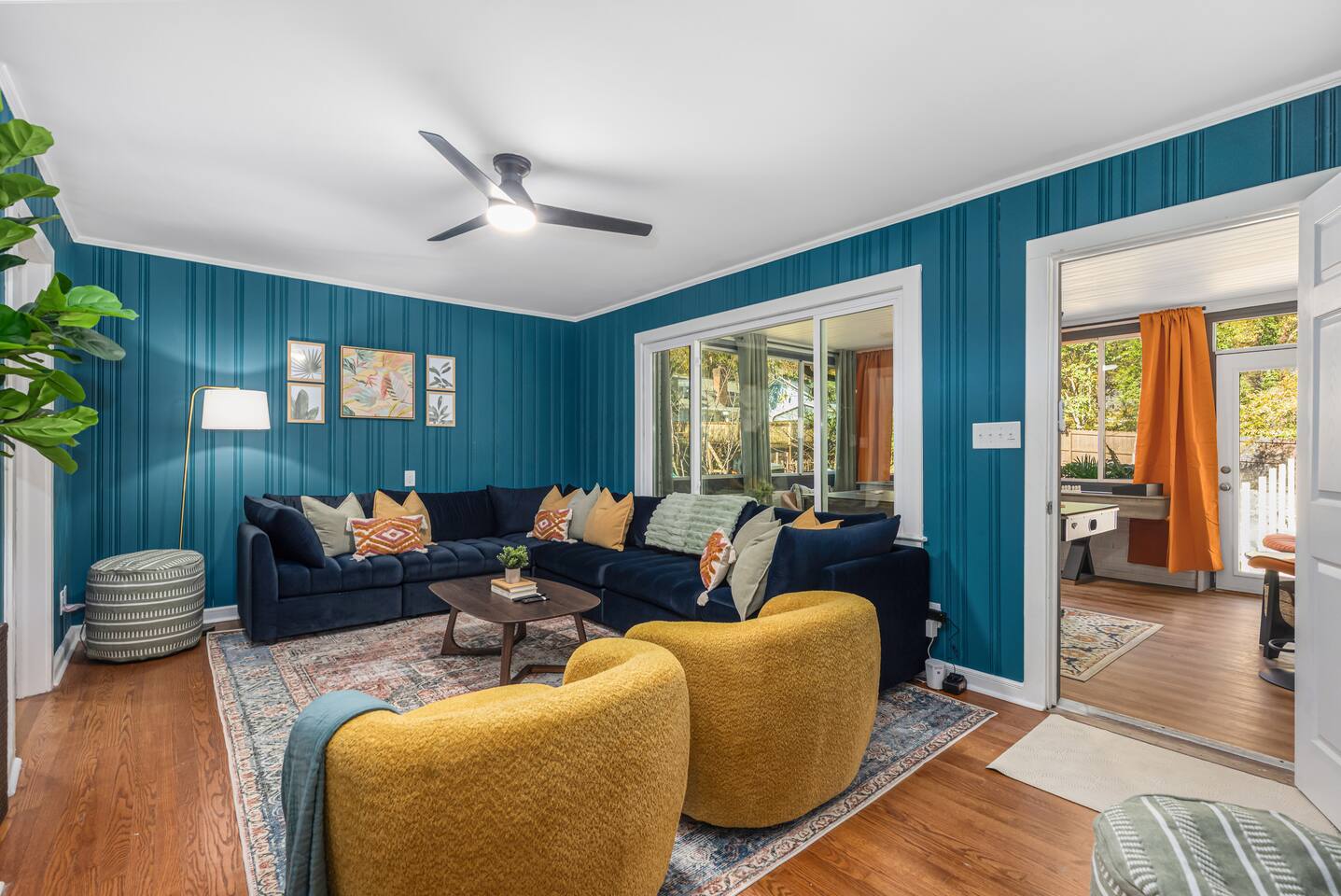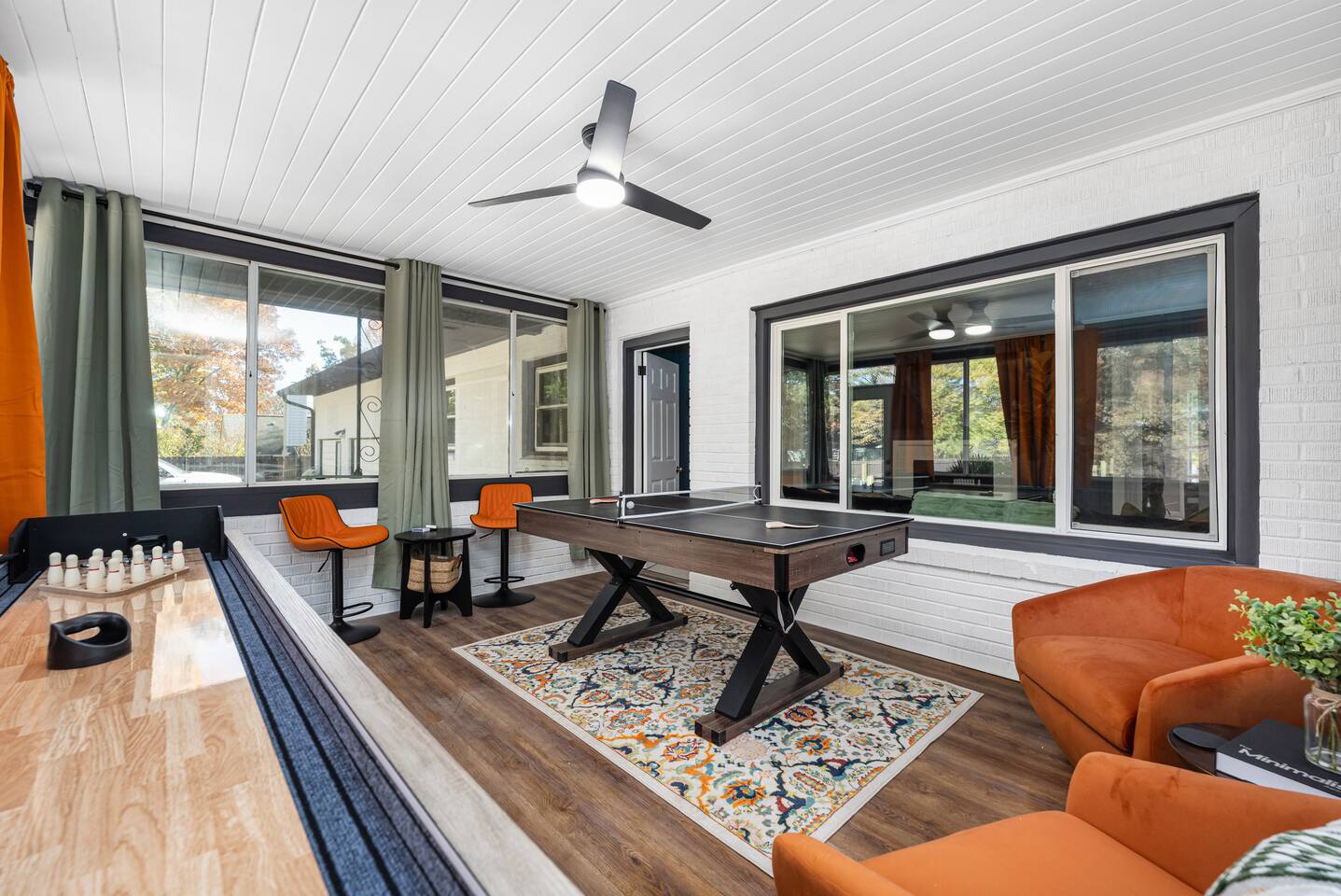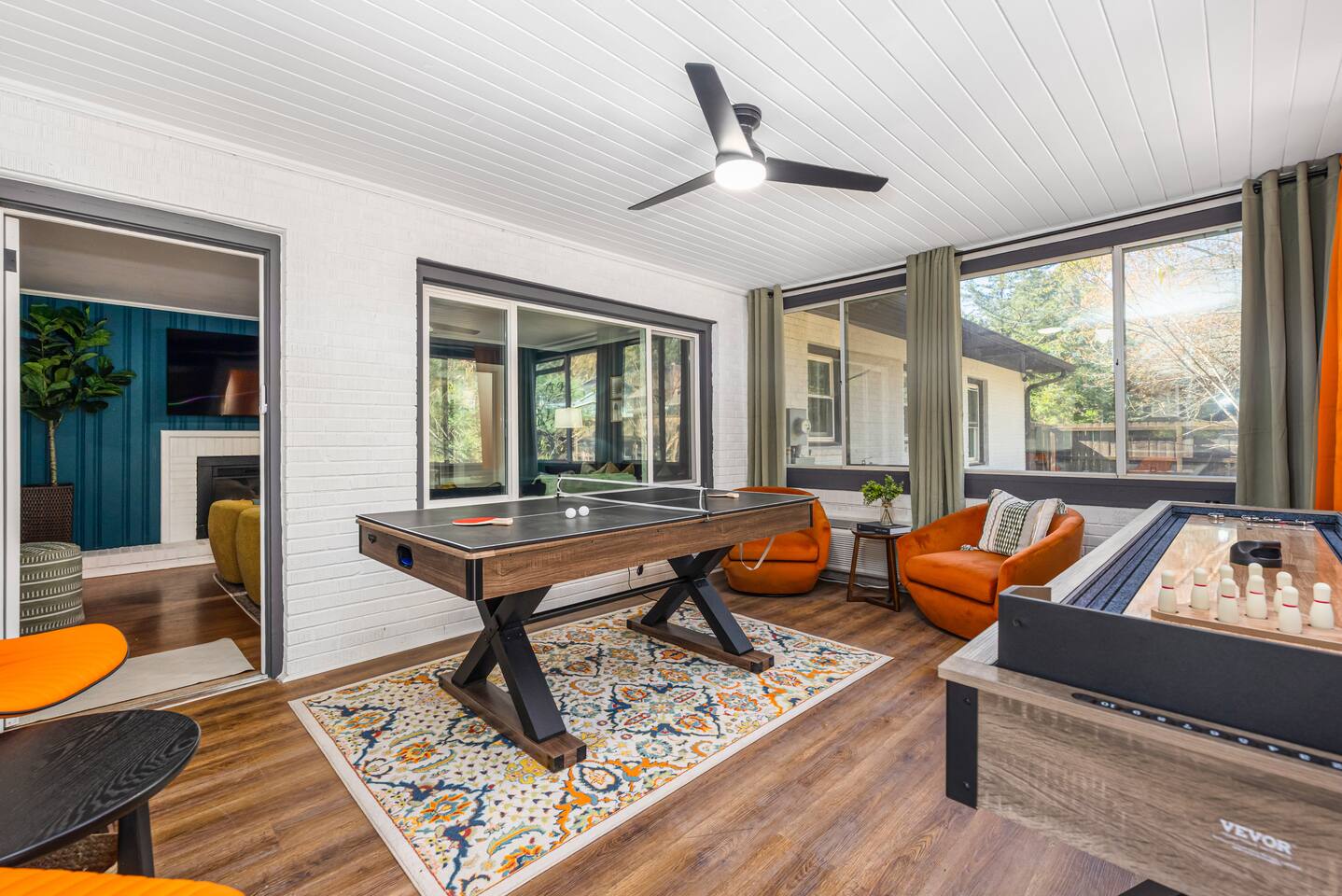 One end of the home has three king bedrooms and two full baths, and the other end of the house has a bunk bedroom, twin bedroom, and a full bath. In the center of the home is where you will all gather in the kitchen, living room, dining room/pool table room, and the game room/sunroom, which is on the back of the house.